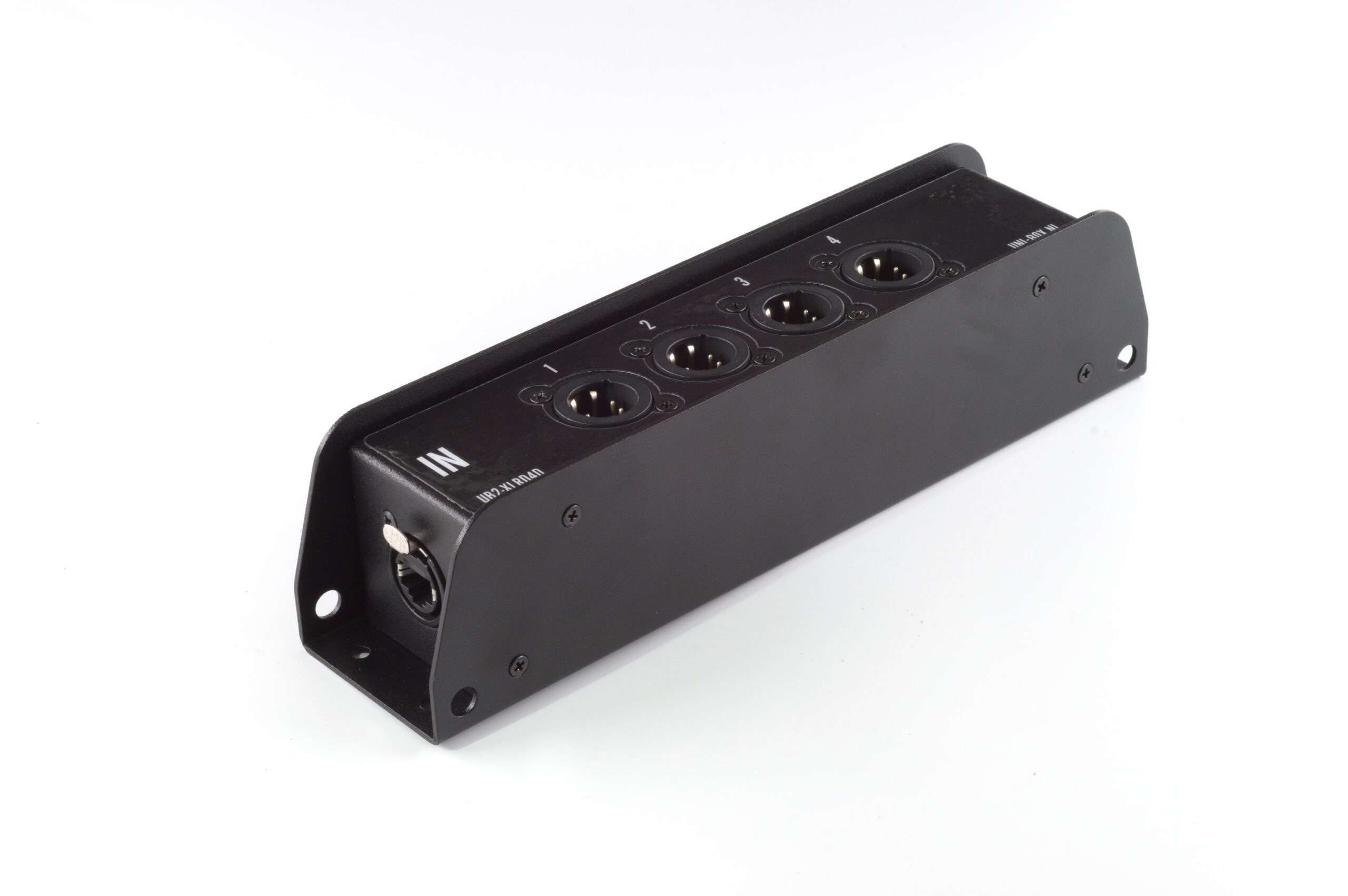 Aan de Kopse Kant 1x Cat in welke intern is opgesplitst naar 4x Xlr male 5 pin Neutrik zwart. Wanneer gewenst kunnen we ook andere pinconfiguraties voorzien dan de standaard configuratie.