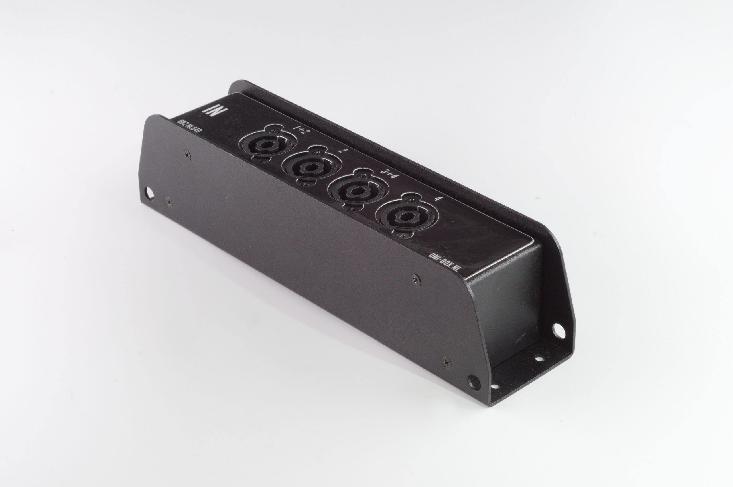 Aan de Kopse Kant 1x NL8 metaal connector welke intern is opgesplitst naar 4x NL4, Wanneer gewenst kunnen we ook andere pinconfiguraties voorzien  dan de standaard configuratie.